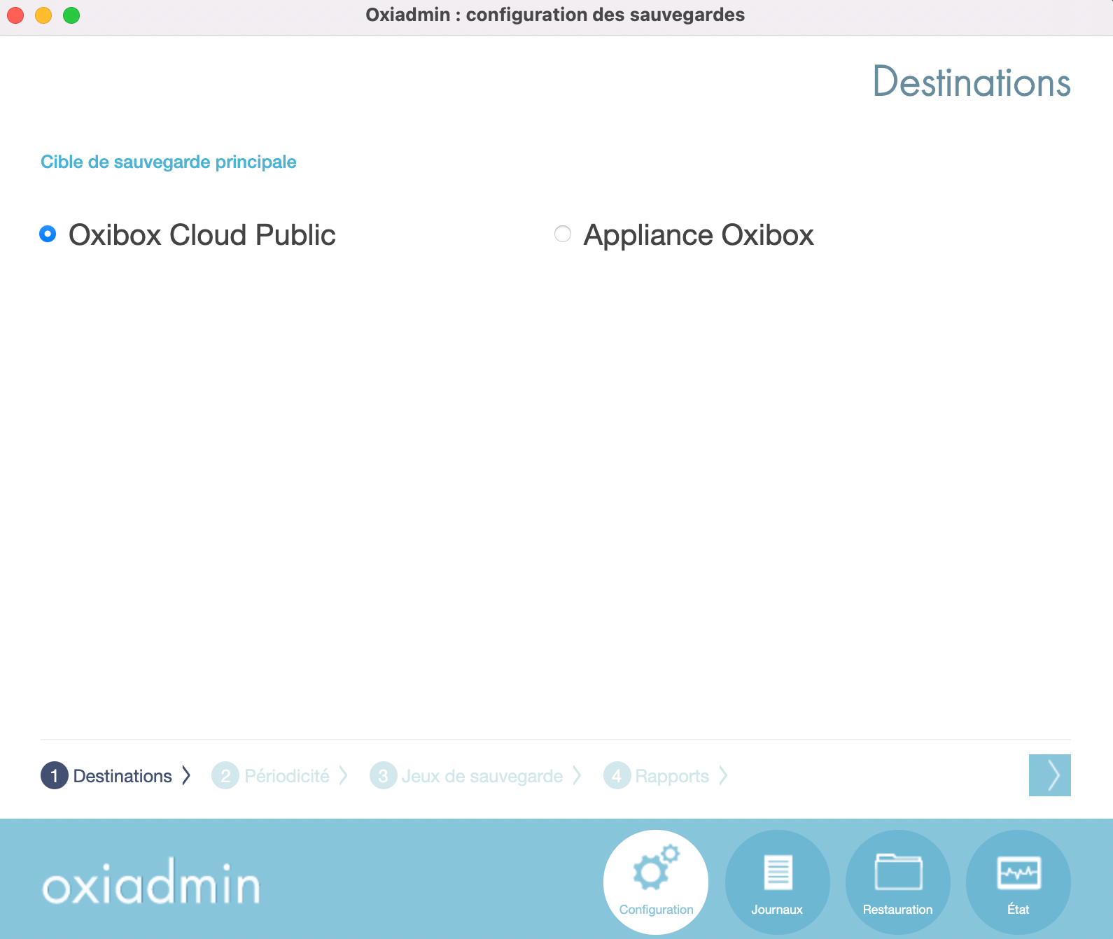 Sélectionnez l’option “Oxibox cloud public” pour une solution full cloud ou pour un compte test. Sélectionnez « Appliance Oxibox » pour tout autre déploiement.