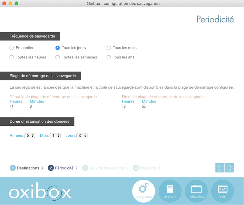Paramétrez la périodicité de sauvegarde selon vos besoins. Vous pouvez choisir la durée d’historisation ainsi que la plage horaire optimale pour le démarrage automatique de la sauvegarde.