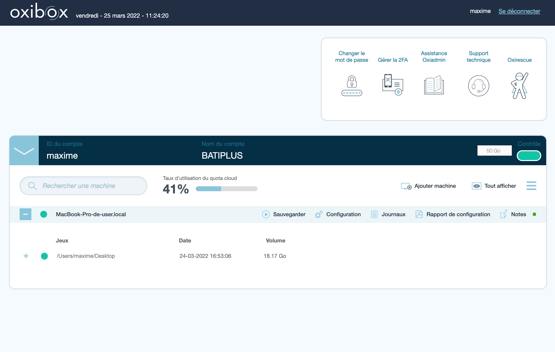 Vous pourrez contrôler en temps réel l’état de vos sauvegardes, modifier la configuration et ajouter des machines. Pour renforcer la sécurité de votre compte nous vous recommandons d’activer l’authentification à double facteur.